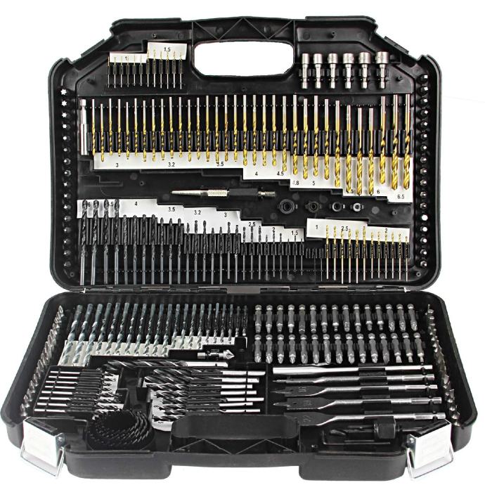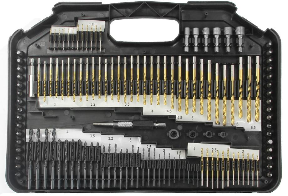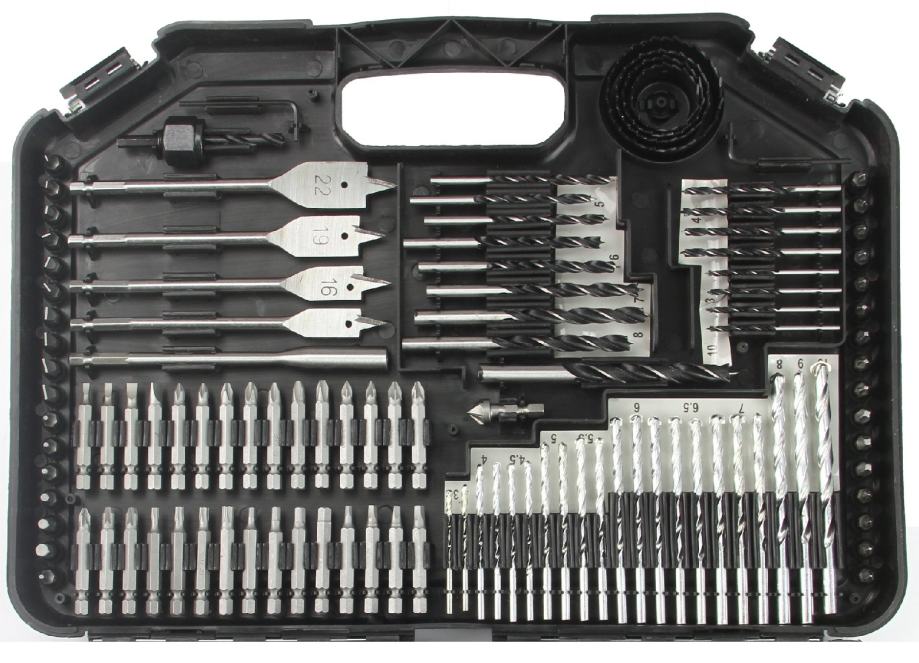 U setu se nalaze svrdla za obradu drveta, metala, betona, svrdla, pile za otvore, imbus nastavci, upuštač, imbus ključ, svrdla, adapteri.