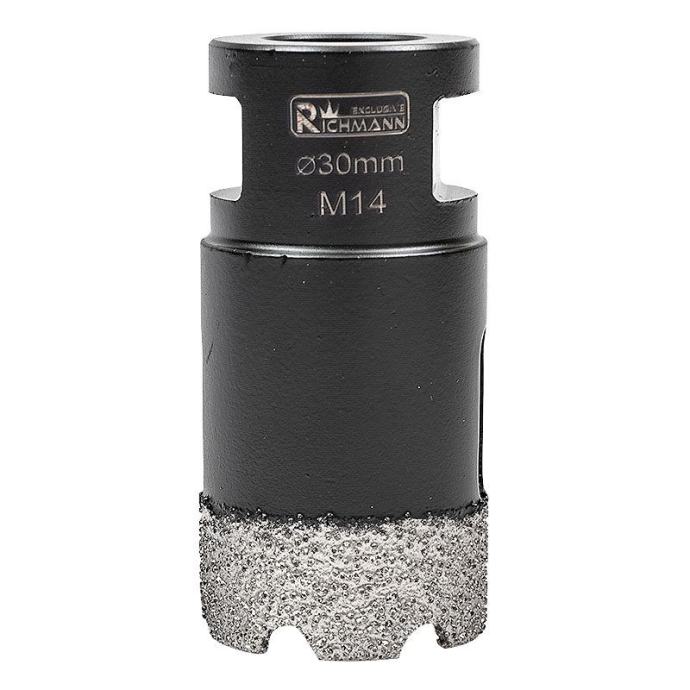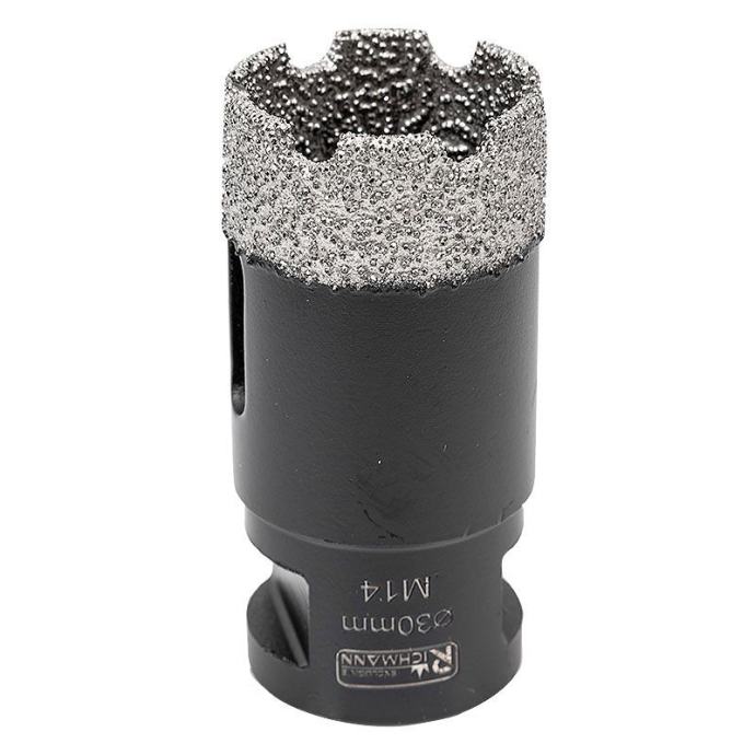 veličina: 30mmradna dužina 40 mmukupna dužina 60 mmnavoj M14radna brzina: 10000-14000 o/minopremljen ručkom s navojem M14 za izravnu montažu na kutnu bušilicunamijenjen za bušenje rupa, između ostalog u kamenoj, porculanskoj, keramici, crijepu, prirodnom kamenu, granitu i mramorusvrdlo pakirana u plastičnu cijev s rupom za vješanje na nosač tj kukumaksimalna radna brzina je 14.000 o/minbočne rupe omogućuju bolje hlađenje i omogućuju uklanjanje krhotina nakon bušenja svake rupetrajnost svrdla za rupe ovisi o vrsti materijala koji se obrađuje, njegovoj debljini te odgovarajućem hlađenju i uporabi.kako bi se produžio njegov vijek trajanja, potrebno je pridržavati se sljedećih pravila:koristi se s uređajima koji osiguravaju odgovarajuću radnu brzinusvrdlo za suhe rupe, stoga NEMOJTE koristiti vodu kao rashladno sredstvopočnite bušiti rupe postavljanjem krunice pod kutom od oko 30 stupnjeva u odnosu na materijal koji se obrađuje i zatim kružnim pokretimakao što je prikazano na ilustrativnoj fotografiji u galerijiprije svakog sljedećeg bušenja provjerite i očistite središte krunicetežina s pakiranjem: 131 g]]>