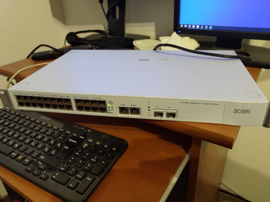 The 3Com 3C17304A 28 port Ethernet switch combines wire-speed Layer 2 switching with easy installation and exceptional reliability. Twenty-four auto-sensing 10/100 copper ports provide flexible desktop and workgroup attachments, while two auto-sensing 10/100/1000 copper uplink ports support stacking or Gigabit connections, and two flexible SFP expansion slots enable an additional choice of fiber or copper Gigabit Ethernet backbone and server connections.