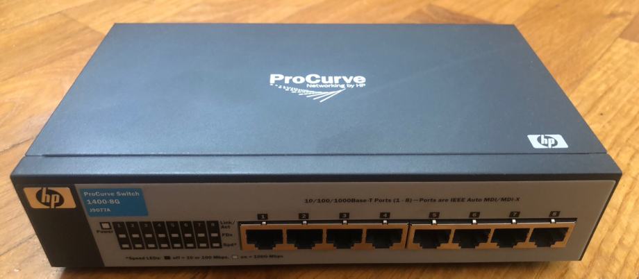 HP ProCurve Switch 1400-8G model J9077A, 8 portni mrežni preklopnik 10/100/1000Base-T. Dolazi s originalnim hp ispravljačem za napajanje i sve je ispravno.