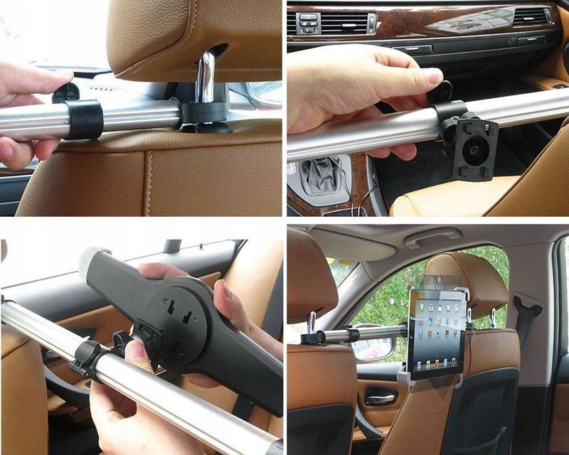 Držač je montiran na nosače naslona za glavu između vozačevog i suvozačevog sjedala. Omogućuje udobno gledanje filmova osobama koje putuju na stražnjem sjedalu.