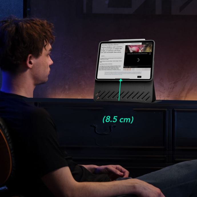 Uzdignuti pogled na ekran još je jedna prednost ovog kućišta. Posebno dizajniran, omogućuje vam da podignete uređaj do linije vidljivosti. Ovo rješenje značajno poboljšava udobnost korištenja i pomaže u održavanju udobnog položaja, omogućujući vam da sjedite uspravno čak i kada koristite uređaj dulje vrijeme.