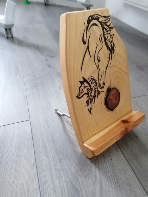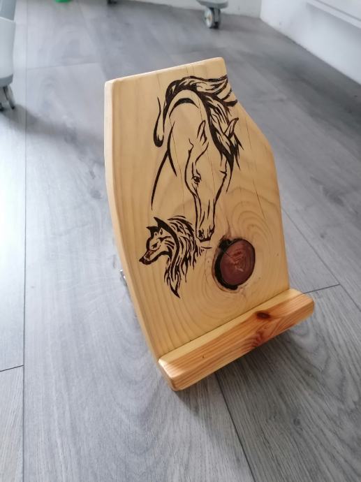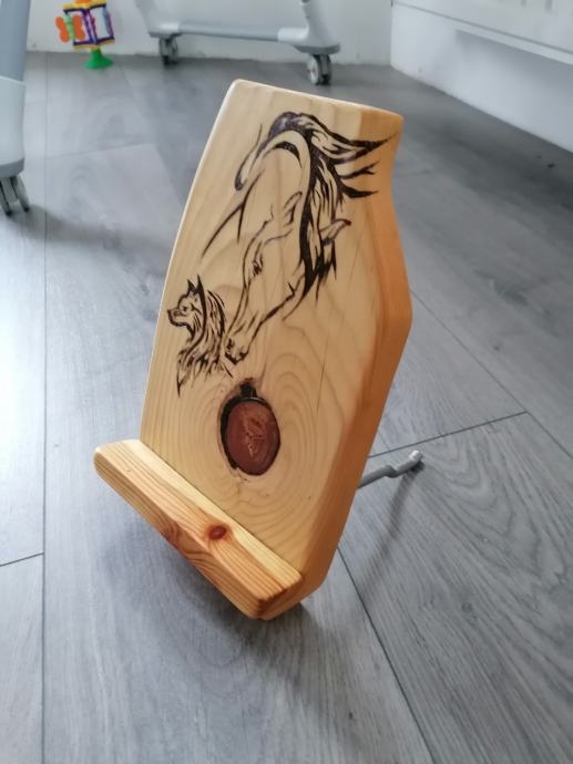 Stalak je unikat.Osobno sam ga izradio ja. Ukrašen pirografom i premazan uljem za drvo. Nogice sa zadnje strane su inox.