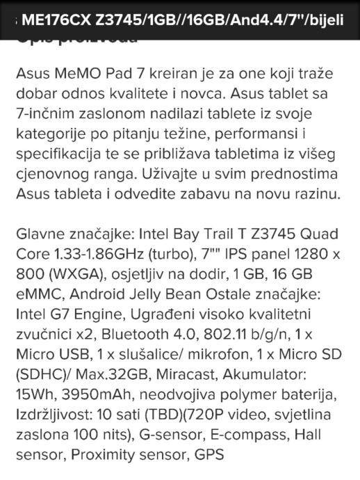 prodajem tablet asus specifikacije su na jednoj od slika,malo koristen to je i razlog prodaje.