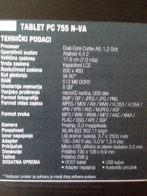 7" , 8 gb memorije, dual core procesor 1.2 GHz, 512 mb rama, sa instaliranim android sustavom 4.4.2, WLAN, mogucnost prosirenja memorije micro sd karticom.