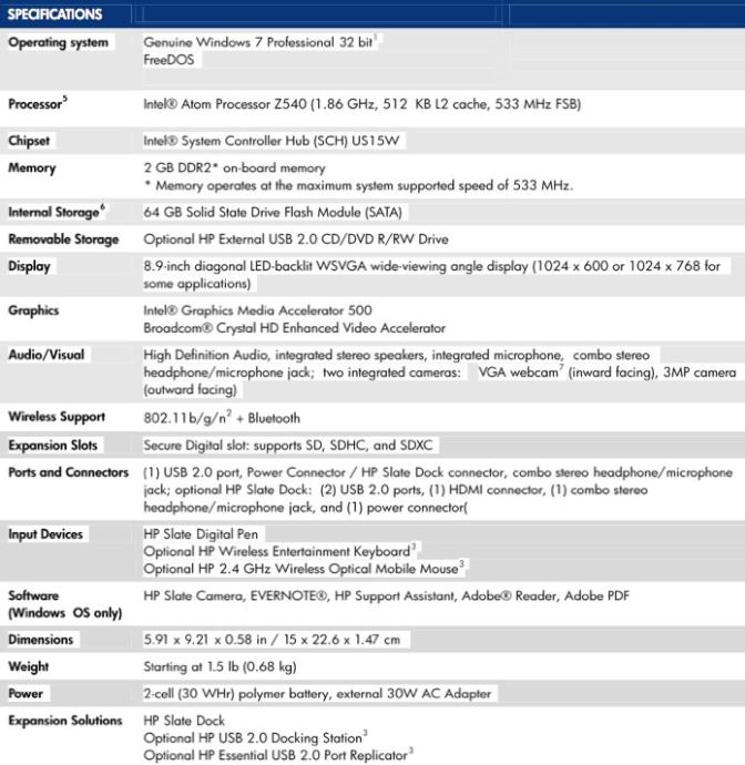 HP Slate dock konektori: (2) USB 2.0, (1) HDMI, (1) combo stereo/headphone jack, (1) power connector