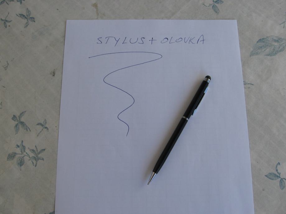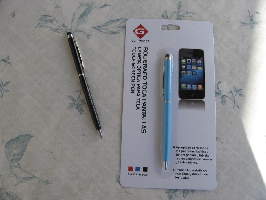 Na gornjem kraju se nalazi gumena kapica za rad na tabletu ili smartphonu, a na donjem je klasična modra kemijska olovka za pisanje.