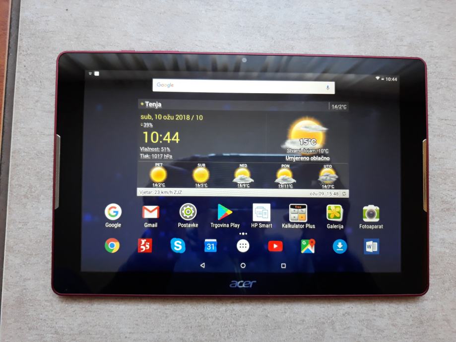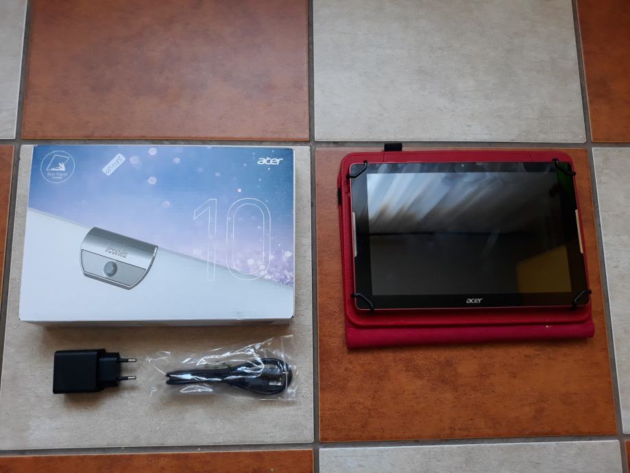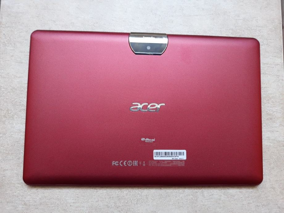 Tablet ACER Iconia One 10 B3-A30 veličine ekrana 10,1" u crvenoj boji. OS Android 6.0 Marshmallow. Vrsta ekrana IPS, rezolucije 1280x800 točaka gustoće 149 ppi, kapacitivni Multi-touch. Procesor Media Tek MT8163, vrsta jezgri ARM Cortex A53, broj jezgri (CPU) 4, broj jezgri (GPU) 2. Ram 1GB, broj kanala RAM-a jednokanalni,, frekvencija 800MHz, interna memorija 16GB proširiva micro SD karticom. Prednja kamera 2MP, zadnja kamera 5MP. Baterija 6100 mAh, punjač 5V/2A. Wi-Fi, Btuethoot i mnoge druge funkcije. Tablet je malo korišten bez ikakvih oštećenja ili tragova uporabe. Ima jamstvo od 04.05.2019 godine. Posjeduje torbicu ladi lakšeg korištenja.