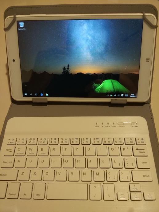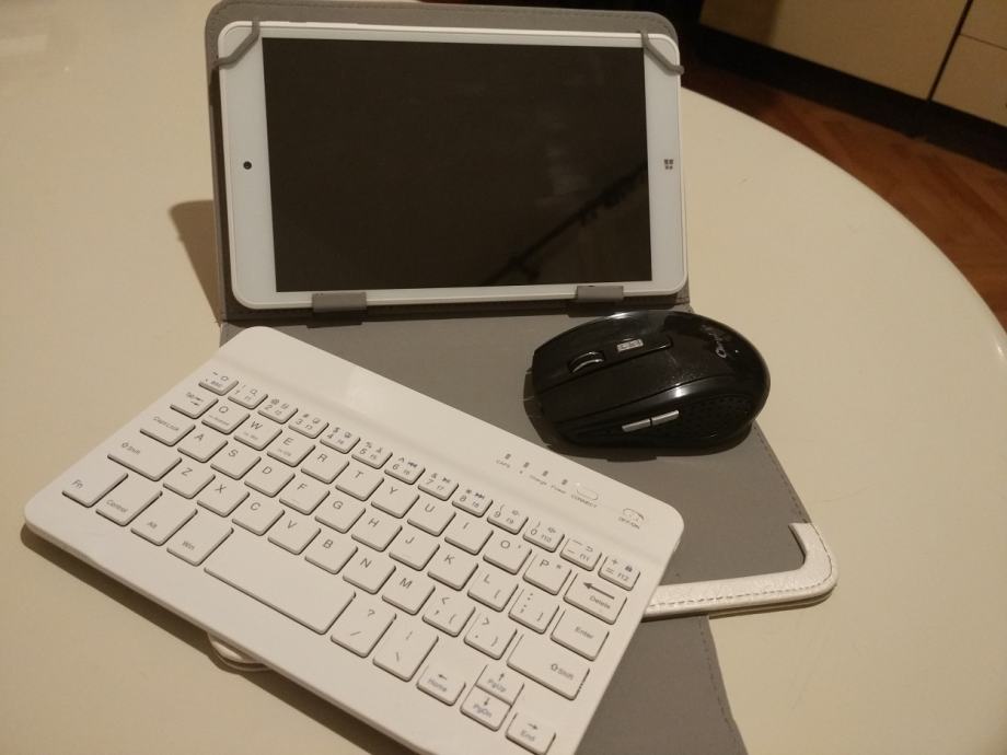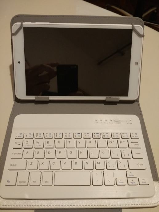 Uz Tablet ide bijela futrola koja magnetski drži Bluetooth tipkovnicu (ima vlastitu punjivu bateriju) i Bluetooth miš (ima vlastitu punjivu bateriju).