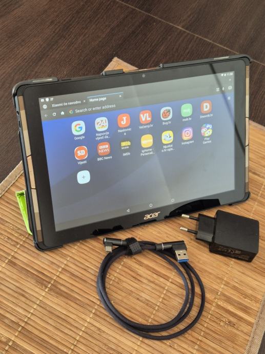 (na zadnjoj slici vidi se komplet: Acer tablet, zaštitna futrola, Acer punjač i USB kabel).