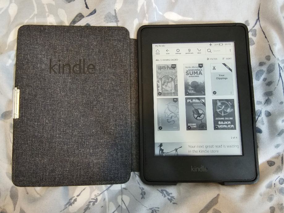 Dolazi u originalnoj Kindle futroli. Baterija drži i po dva/tri tjedna, 4 GB interne memorije i pozadinsko osvjetljenje. Nedostaje micro USB kabel za punjenje.