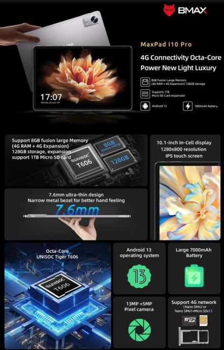 Sasvim novi uređaji, imam nekoliko komada, iskusite vrhunsku tehnologiju s BMAX I10 Pro tabletom! Opremljen najnovijim Android 13 sustavom, ovaj tablet nudi brzo, sigurno i jednostavno korisničko iskustvo. Savršen za putovanja i poslovna putovanja s podrškom za SIM karticu i 4G LTE mrežu. Uživajte u kristalno čistom HD IPS zaslonu i odličnim performansama zahvaljujući 8GB RAM-a i 128GB ROM-a. Izvrsne kamere od 13MP i 5MP omogućuju snimanje visokokvalitetnih fotografija i videopoziva. Tablet dolazi s EU utikačem.