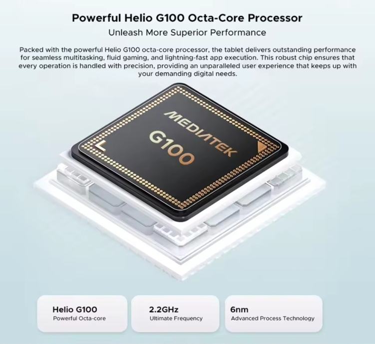 Procesor: MediaTek Helio G100, octa-core 2.2 GHz (6nm)
