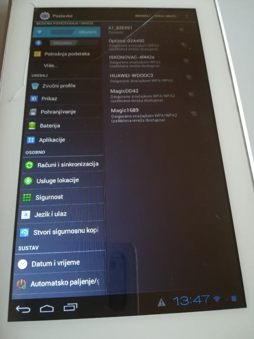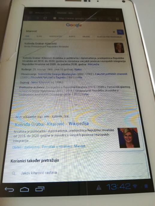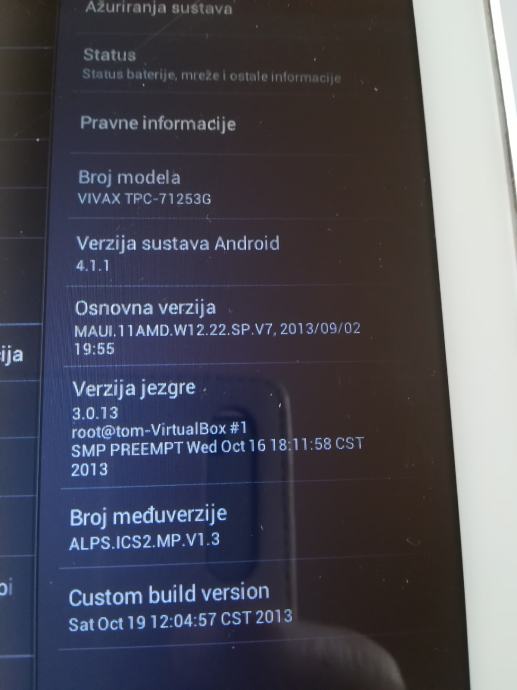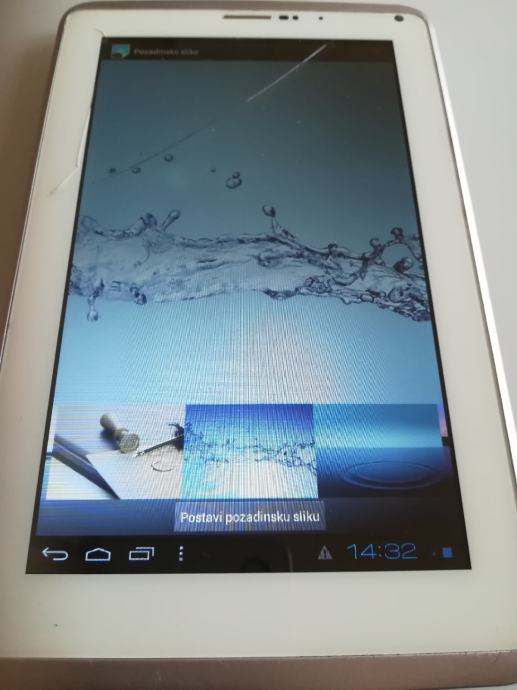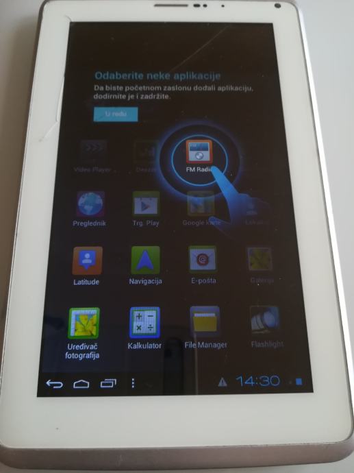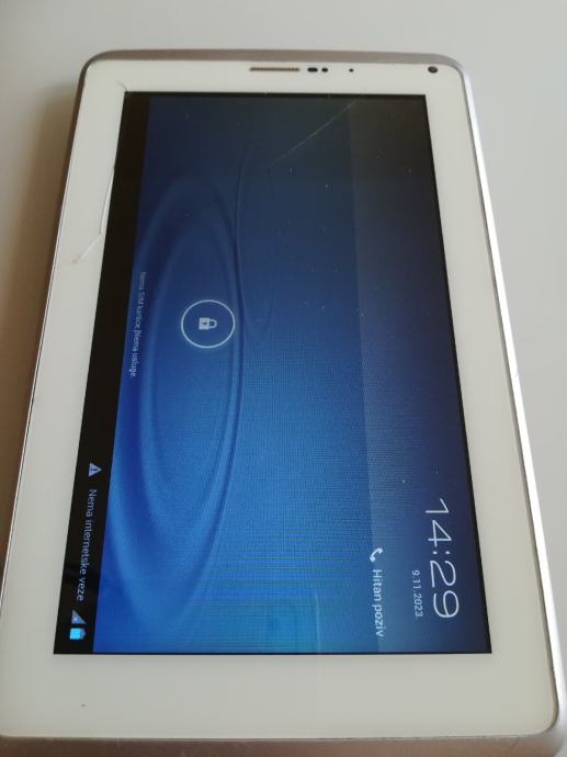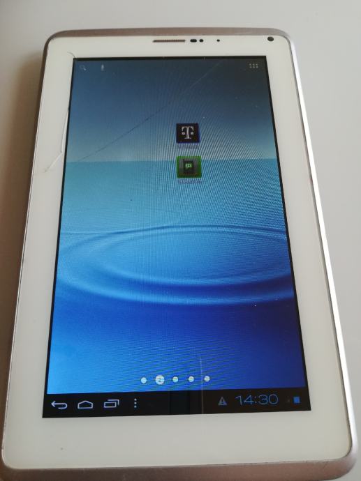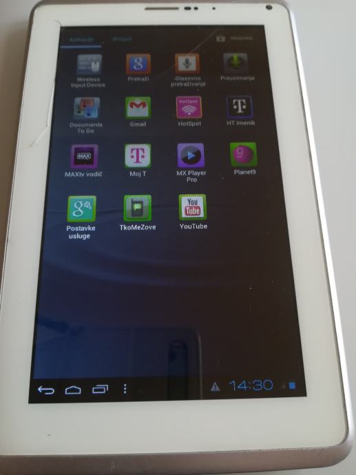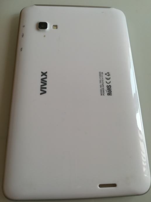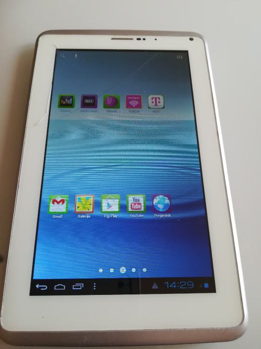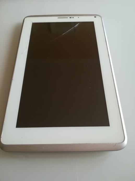 VIVAX TPC-71253G, djelomično ispravan, ne može se spojiti na Trgovinu aplikacija, staklo napuklo u gornjem kutu ne utjeće na rad. 7 inch, android 4.1,dual core 1.2, 512 MB/do 32 GB na SD kartici, GPS, GSM, 3200 mAh