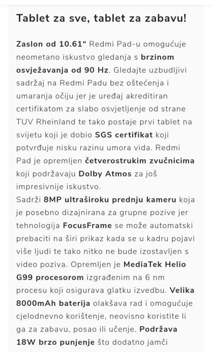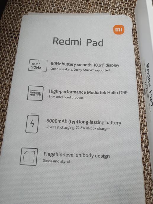 Prodajem novi TABLET, Xiaomi Redmi Pad, nikad nije upaljen, novi iz trgovine, iz kutije izvađen samo za slikanje...uz njega ide punjač. 4GB 128GB, vrhunske specifikacije.