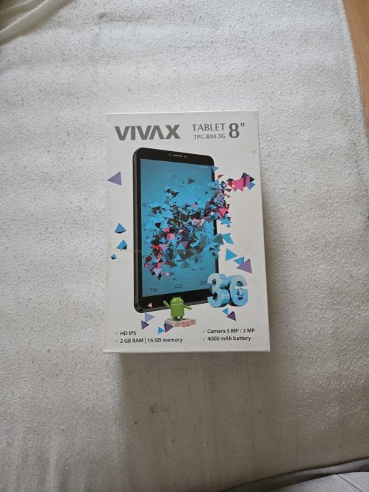 Prodajem VIVAX tablet s 8-inčnim ekranom. Uređaj ima 2 GB RAM-a i 16 GB memorije te dolazi s prednjom i stražnjom kamerom (5 MP / 2 MP). Baterija ima kapacitet 4000 mAh. Tablet podržava 3G mrežu. Vide se tragovi korištenja.