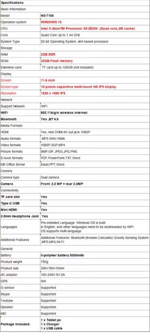 Tablet ima IPS ekran rezolucije 1280x800 piksela, prednju i stražnju kameru (2MP), te ugrađen WiFi i Bluetooth. Pokreće Windows 10 operativni sustav s mogućnošću nadogradnje na Windows 11. Baterija kapaciteta 6500mAh omogućava više sati korištenja.