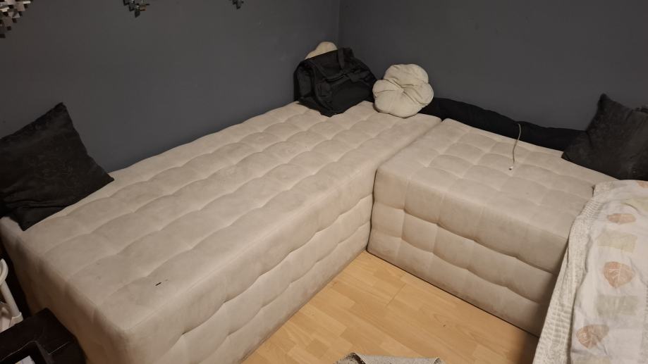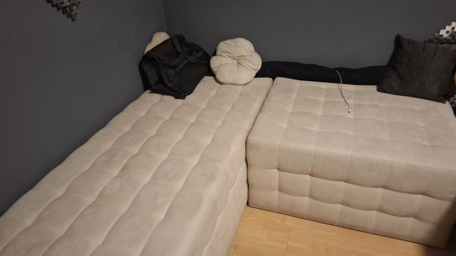 Garnitura u tri djela.Dva djela su dimenzije 100×80,a jedan je 200×80.Visina sjedišta je 50 .Rabljeno,al jako očuvano.Lako se održava.Na jednom mjestu od selotepa flek što se vidi na slici.Molim zainteresirane da zovu na 095/9088-107