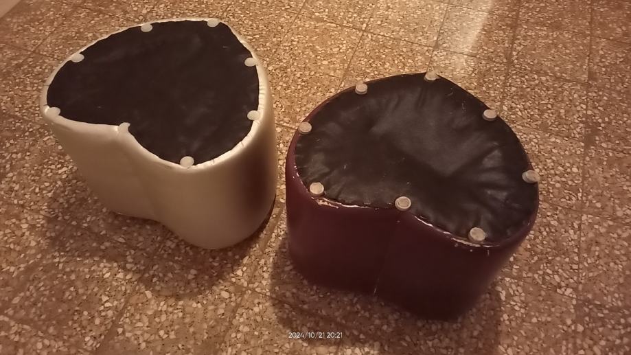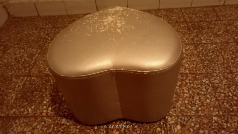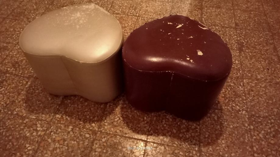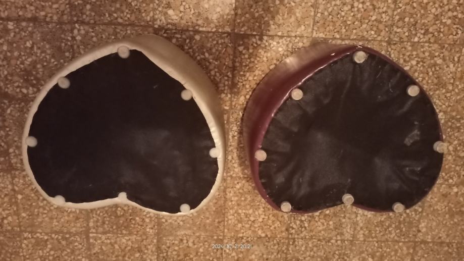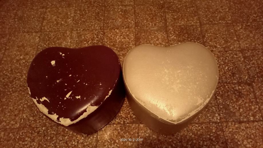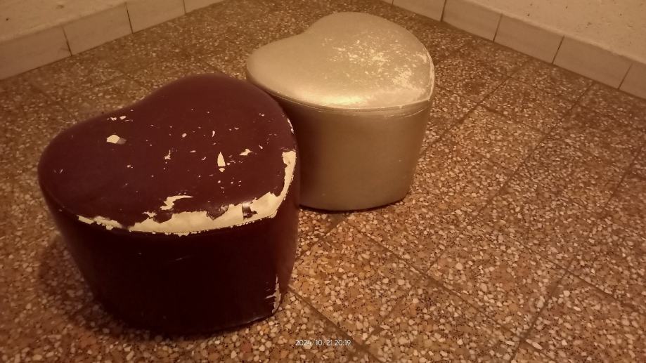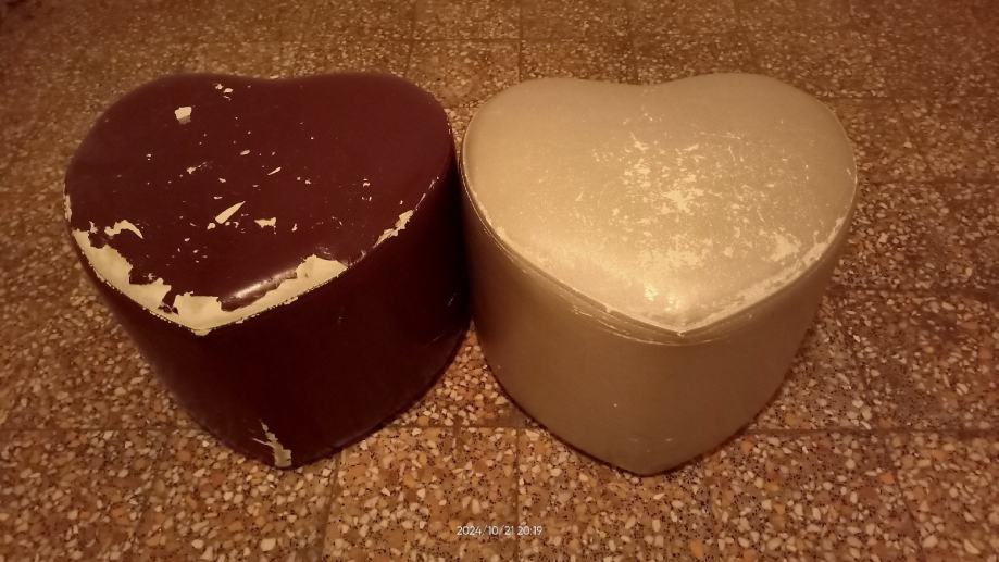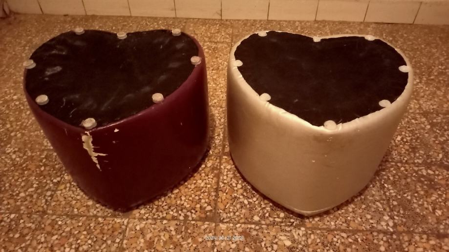 Prodajem 2 taburea u obliku srca. Potrebno ih je tapecirati. Sama konstrukcija je u super stanju, stranice i podnožje bez mehaničkih oštećenja. Boja srebrna i čokoladna. Dimenzije visina 28 cm, širina 39 cm, dubina 34 cm. Cijena 10€ komad. Molim zvati na mob. 091/2356157