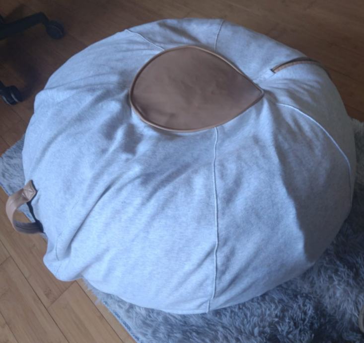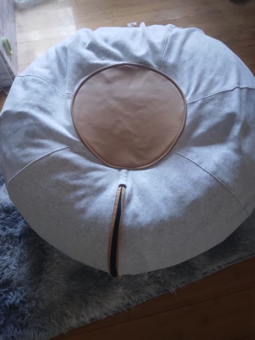 Prodajem vreću za sjedenje u sivoj boji s kožnim detaljima u smeđoj/bež nijansi. Presvlaka je izrađena od tekstilnog materijala, a sjedišni dio ukrašen je kružnim kožnim umetkom. Sa strane se nalazi kožna ručka koja olakšava premještanje. Vreća je solidnih dimenzija i pruža ugodno sjedenje.
