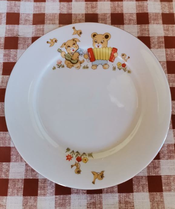 Plitki porculanski dječji tanjurić, pozlaćeni rub