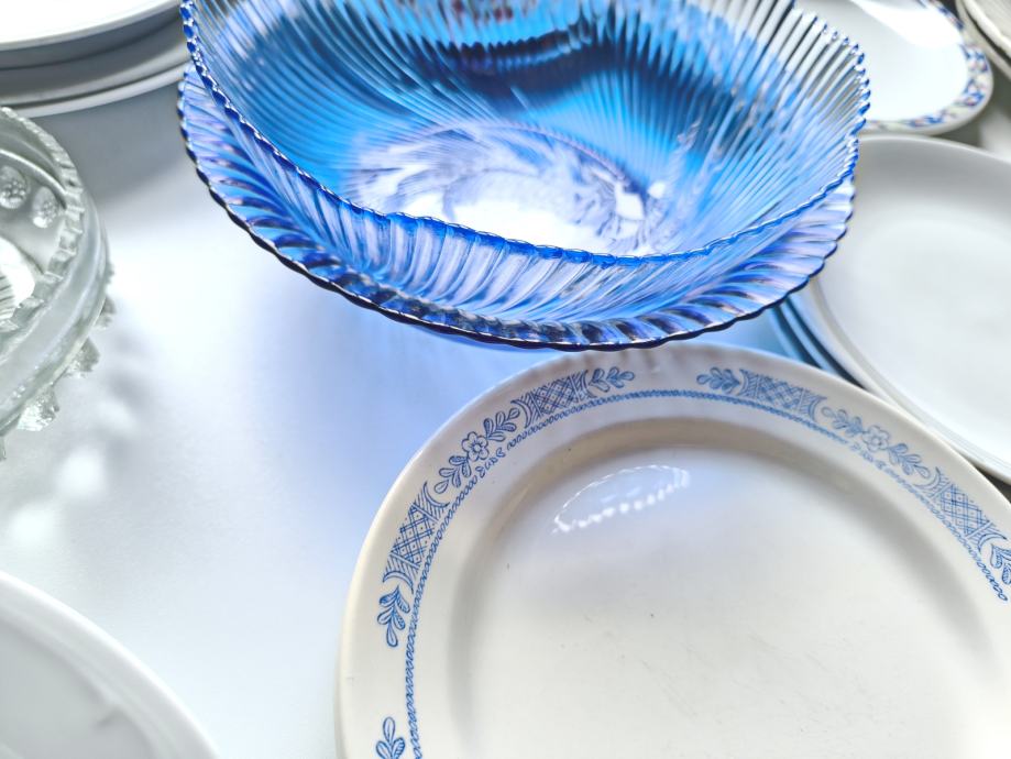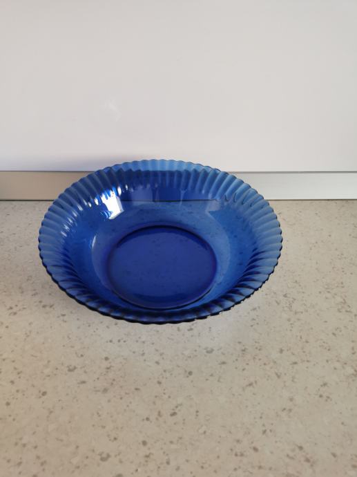 12. Tamnije plava staklena zdjela promjera 24,5 cm, visina 6,5 cm i svijetlo plava staklena zdjela sličnih dimenzija. Obje zdjele kao nove. Jedna 4 eura.