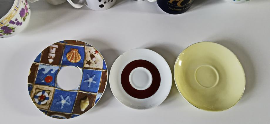 10. Mali tanjurići za šalicu ili desertni - sva tri komda, žuti, morski sa školjkicama i sa smeđom prugom, 2 eura