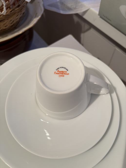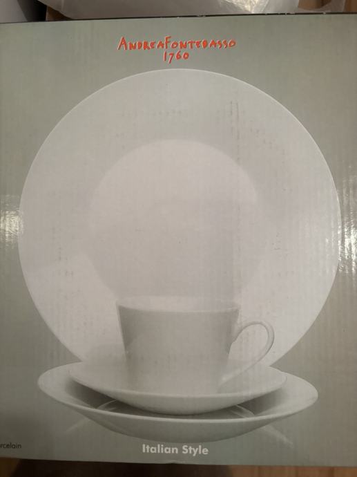 Novo neupotrebljavana 2 kompleta plitki, duboki, mali plitki tanjur sa šalicom, fini porculan, talijanski dizajn.
