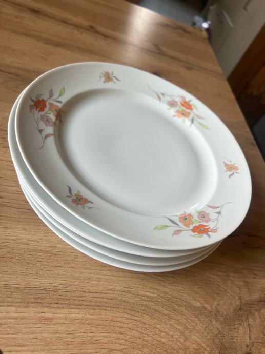 Prodajem set od 4 plitka tanjura proizvođača Alföldi Porcelán iz Mađarske. Bijele su boje s nježnim cvjetnim motivom u narančastoj i rozoj nijansi. Promjer tanjura je oko 24 cm. Stanje je novo.