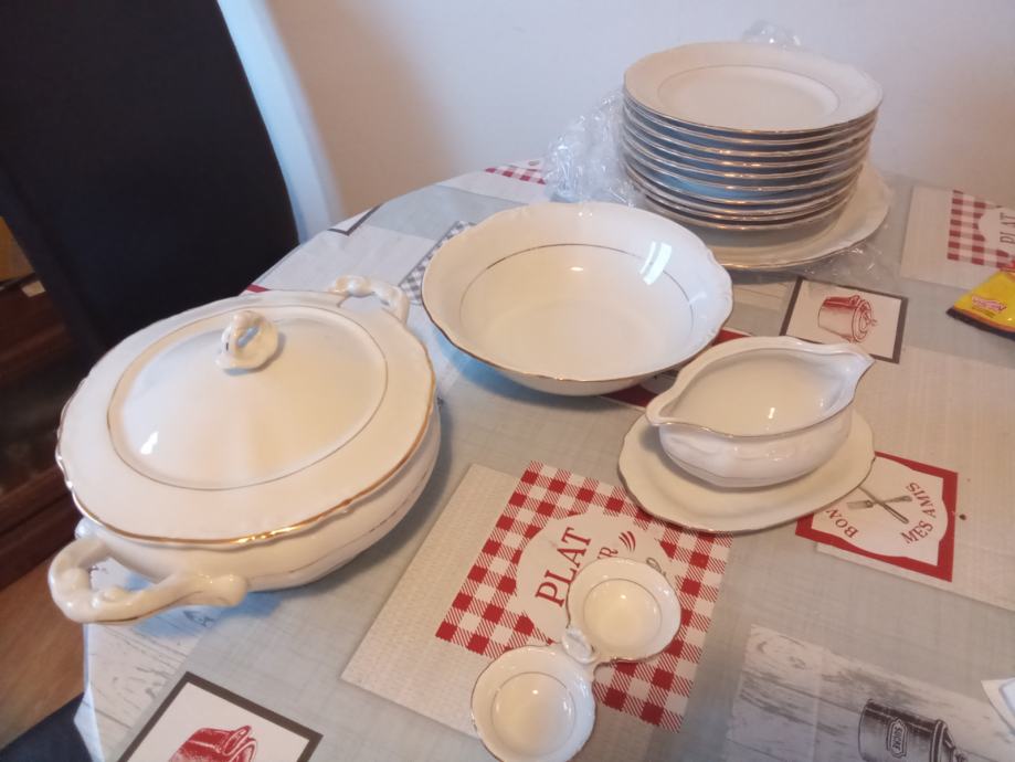 Servis bijeli sa zlatnim obrubom. 6 plitkih tanjura,4 duboka tanjura, 6 desertnih tanjura, 1 veliki okrugli tanjur, 2 zdjele za salatu, 1 posuda za juhu s poklopcem, 1 posuda za umak i 1 posuda za sol i papar. Sve očuvano,jedino kod dubokih tanjura malo isprana pozlata.
