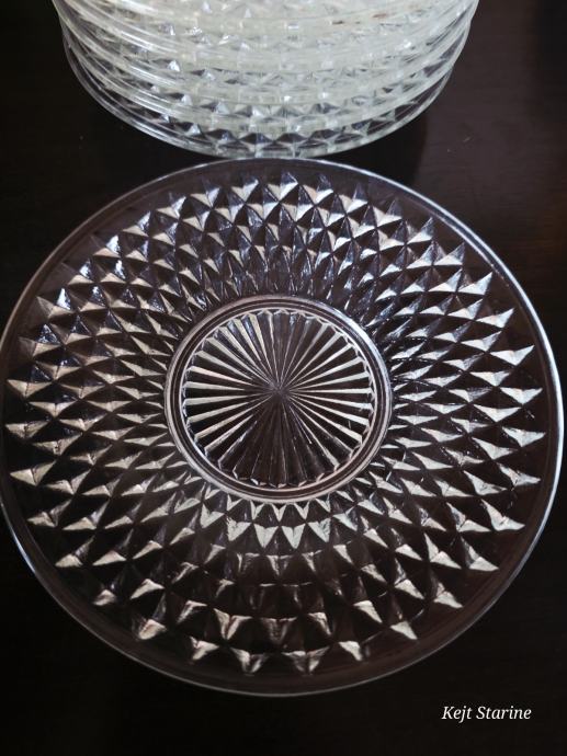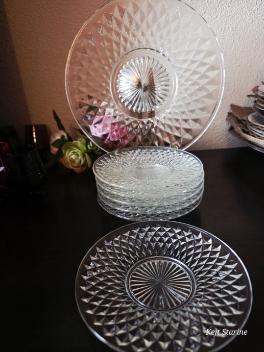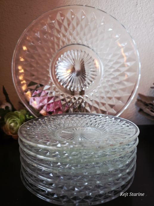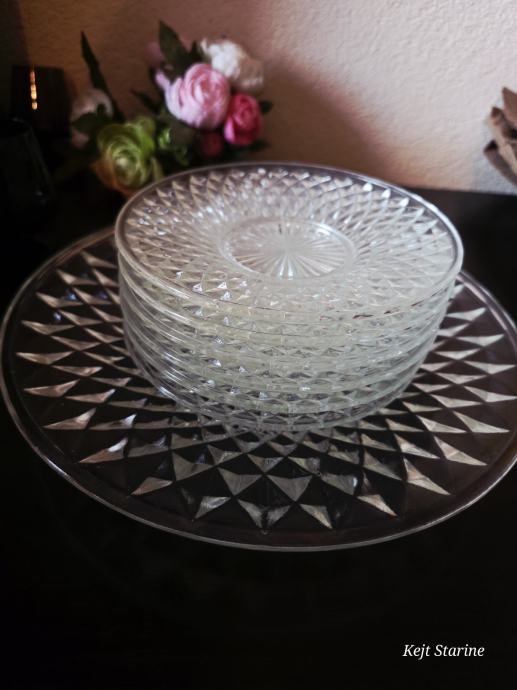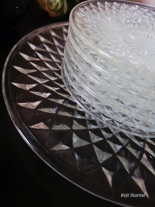 Set je s dijamantnim uzorkom, vjerojatno namijenjenih posluživanju deserta ili torte. Predmeti su prozirni i imaju reljefnu teksturu koja podsjeća na brušeno staklo ili kristal.