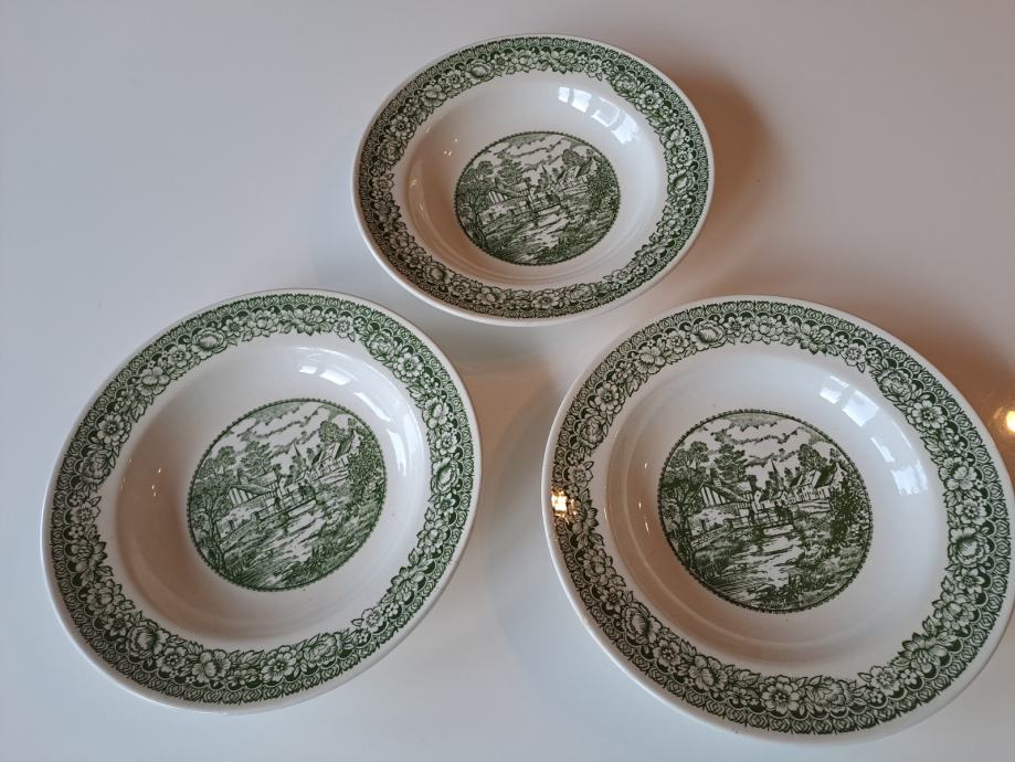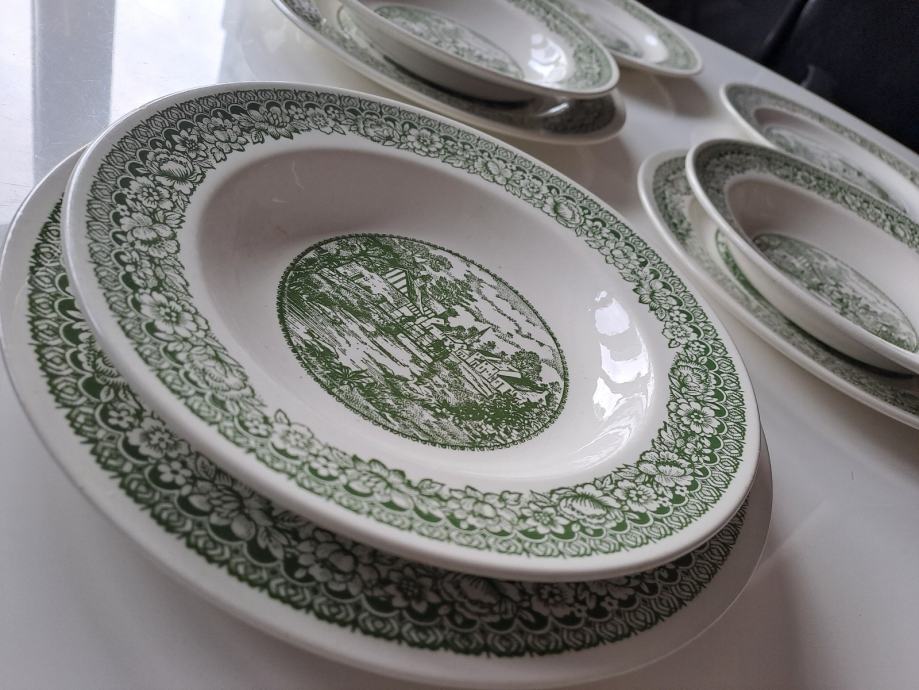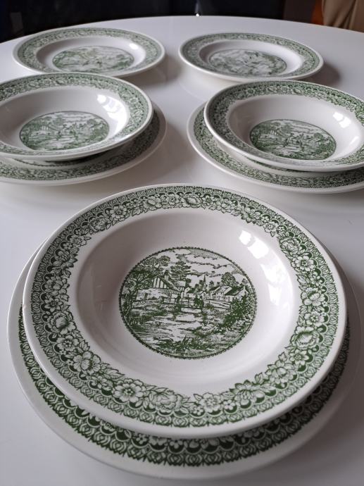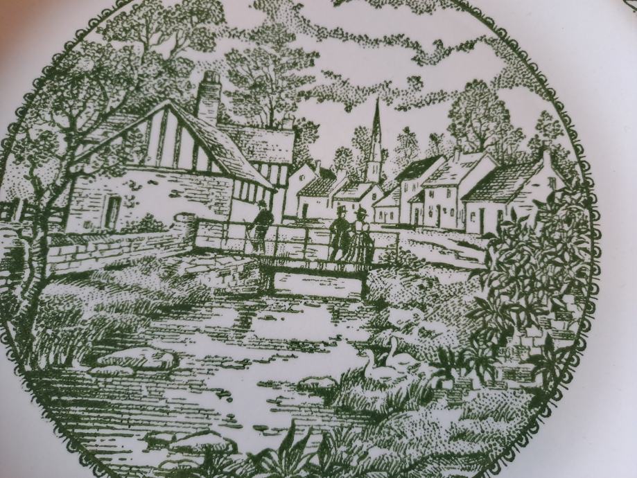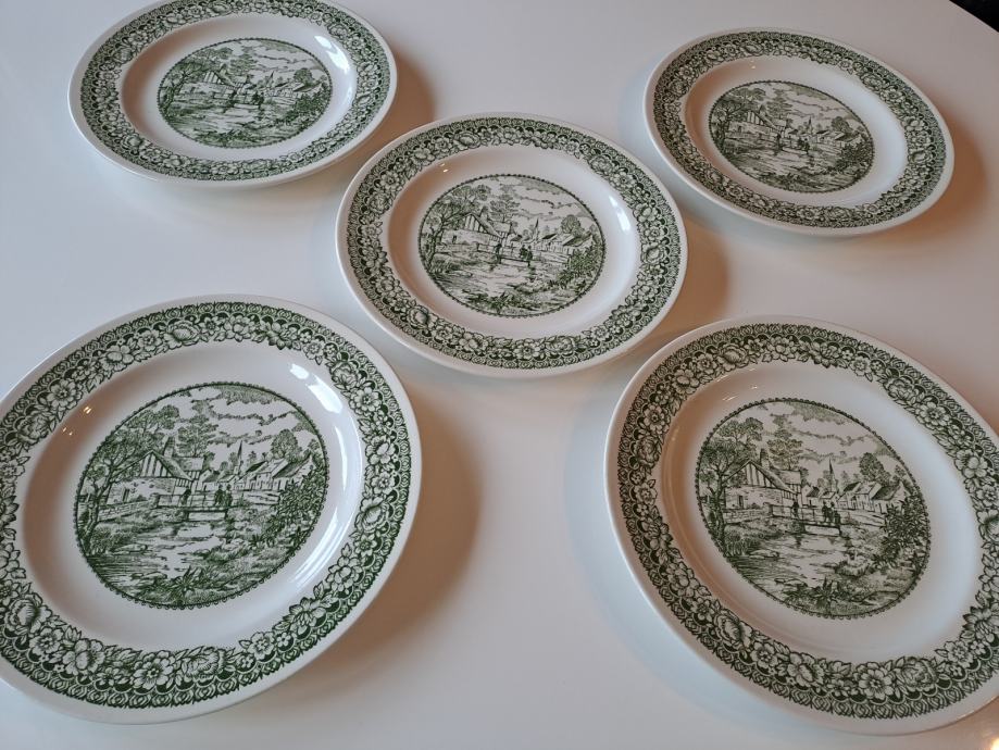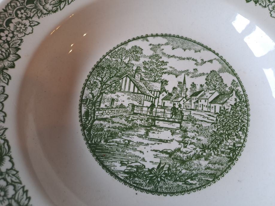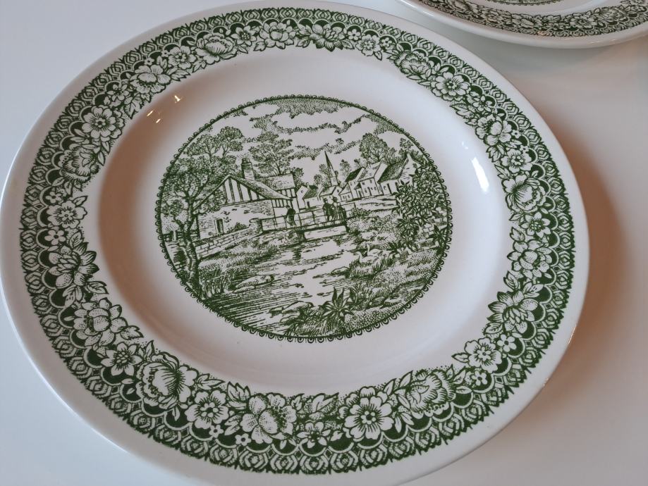 Prodajem prekrasan set od 8 starinskih tanjura od engleske željezne keramike (fajansa/ironstone) sa šarmantnim zelenim transferware uzorkom koji prikazuje seoski pejzaž. Set se sastoji od 5 plitkih i 3 duboka tanjura.