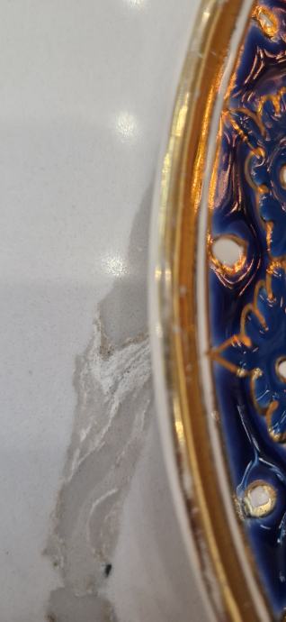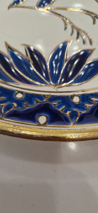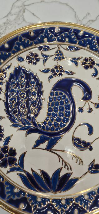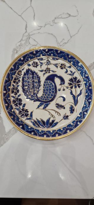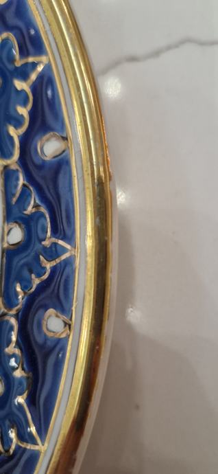 Ukrasni zidni tanjur.Ručni rad Grčka.Tanjur je u dobrom stanju,na vanjskom rubu na mjestima je izbljedila pozlata,(vidljivo na slikama).Jedva primjetno.Promjer 25 cm.