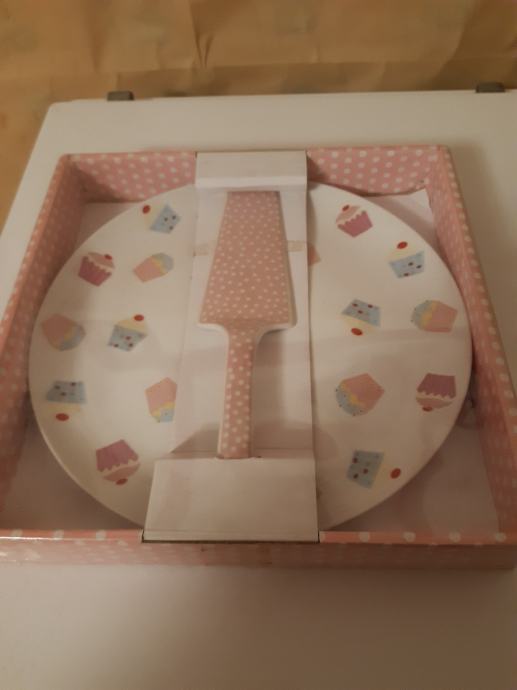 Prodajem potpuno novi porculanski tanjur za torte, promjera 28 cm, sa pripadajućom lopaticom za torte.