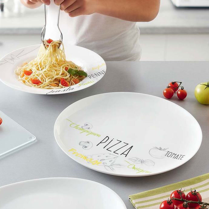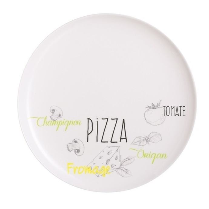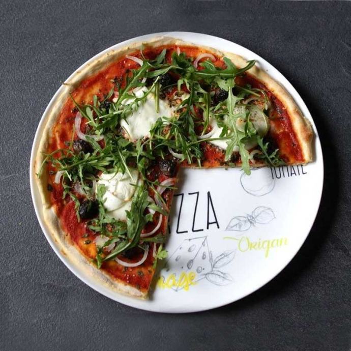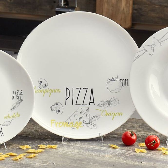 Tanjur je lijepo oslikani s motivima različitih sastojaka pizze i s natpisima najpoznatijih vrsta pizza.