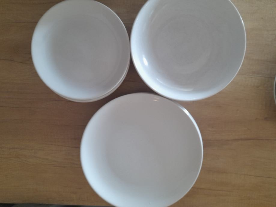 Bijeli keramički tanjuri, 5 plitkih, 3 duboka, 6 desertnih, 10 eur.