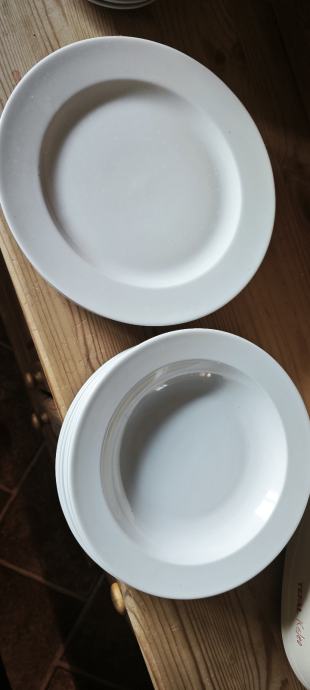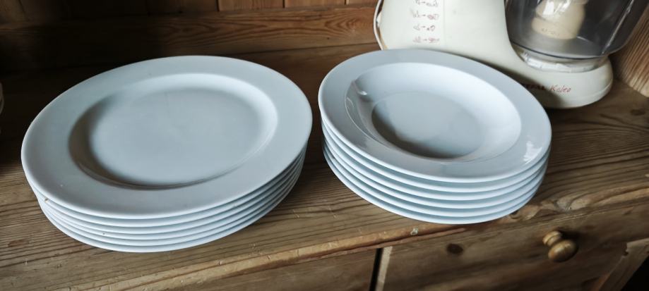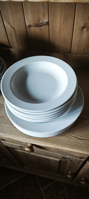 Prodajem set bijelih tanjura, 6 plitkih i 6 dubokih tanjura, jednostavnog i klasičnog dizajna. Tanjuri su bijele boje, bez ukrasa ili uzoraka.