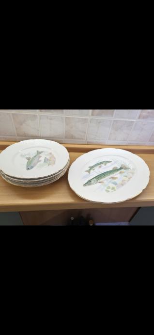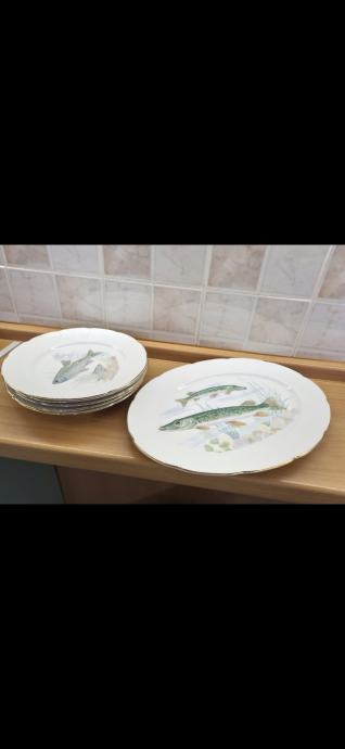 Prodajem set tanjura za ribu. Tanjuri su bijele boje s motivom ribe i zlatnim rubom. U setu se nalazi 5 komada i jedan veliki.