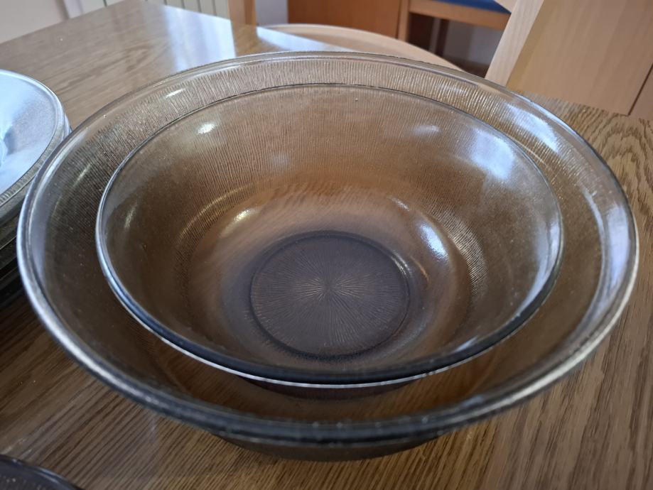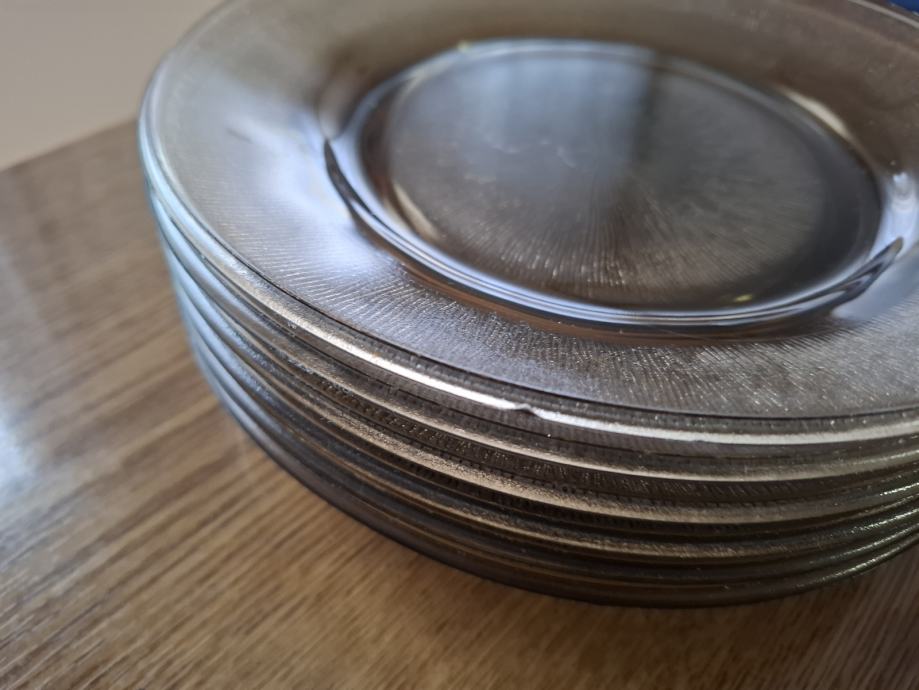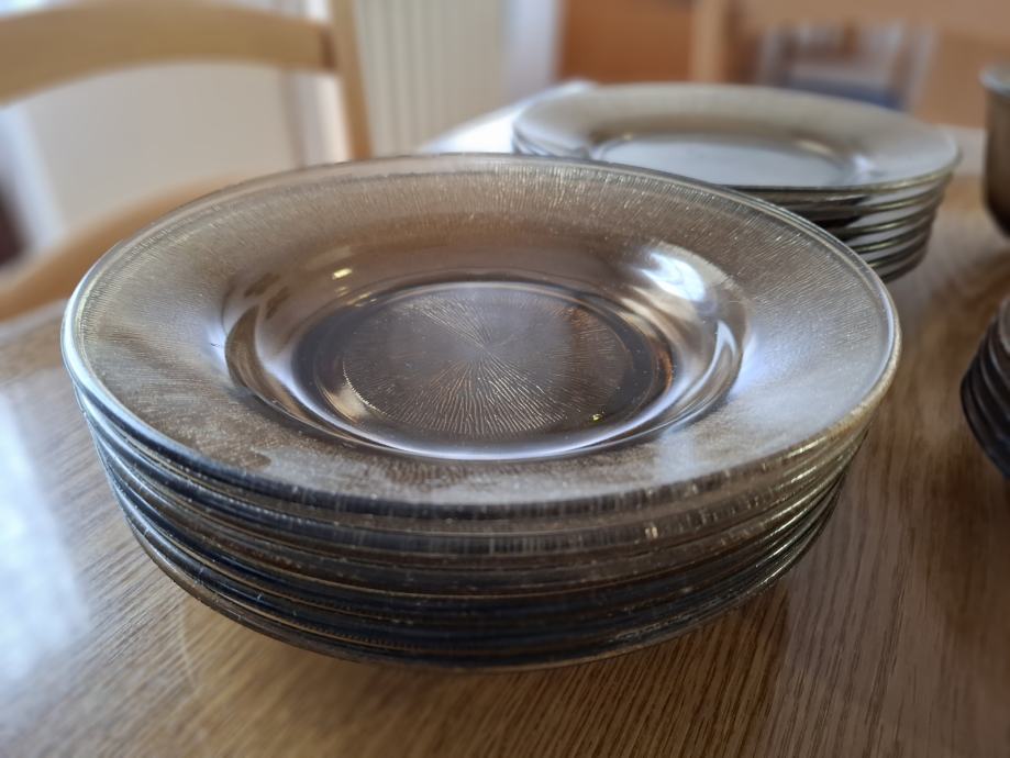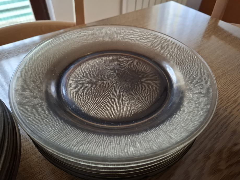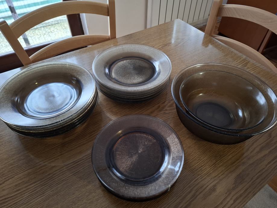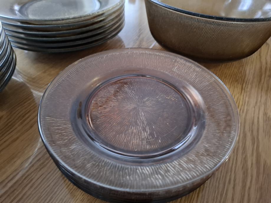 Izrađeno je od stakla. Kupljeno krajem 80-ih godina u tvornici Borovo. Tanjuri nisu korišteni, a zdjele možda par puta. Jedan tanjur ima sitno oštećenje ( vidljivo na fotografiji).
