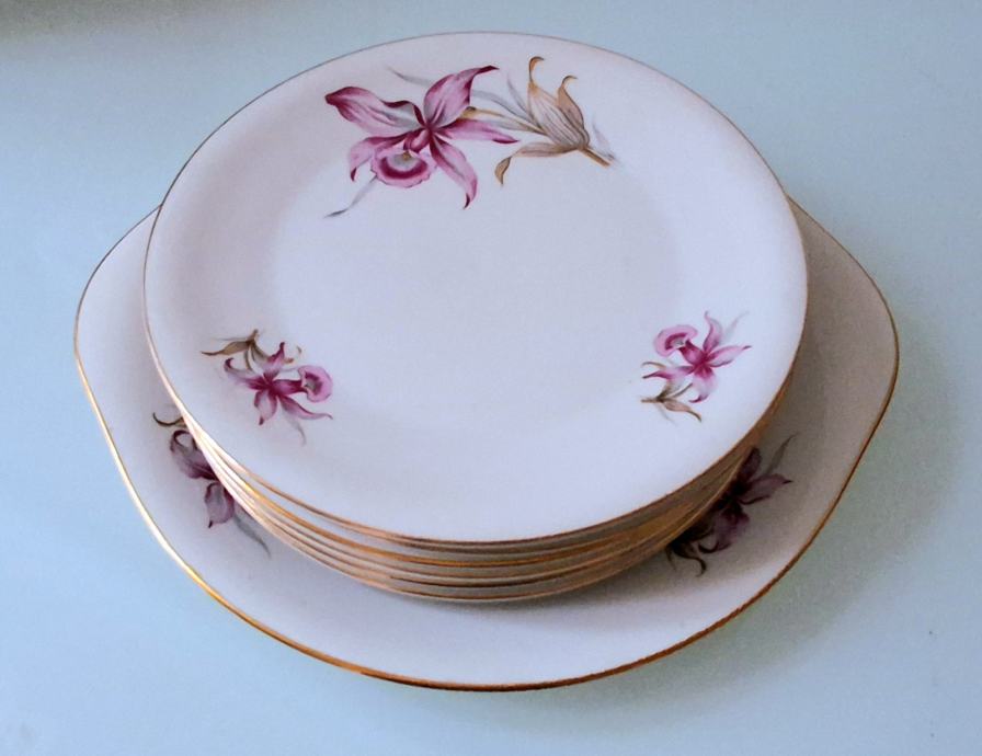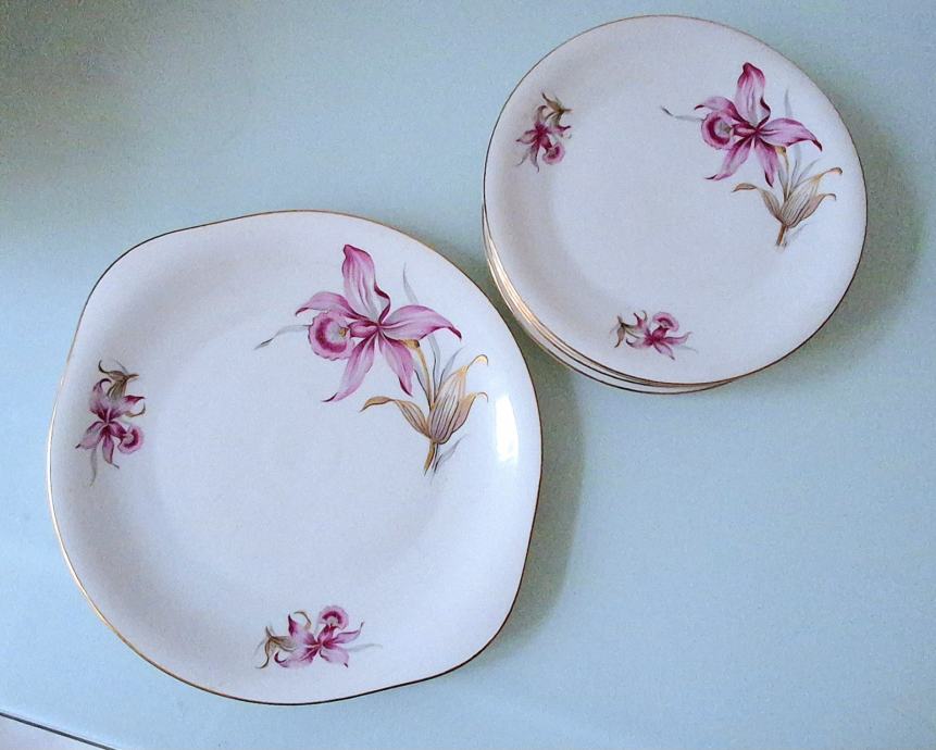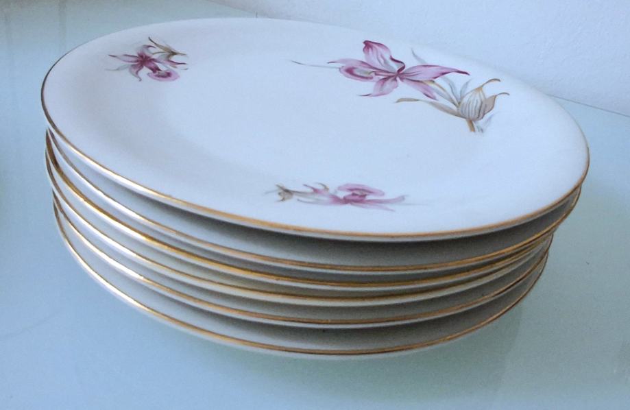 Set za desert, 6 tanjura i jedan veći za tortu/ kolače. Pozlaćeni rubovi, neoštećeno. Cca 40 godina staro. Nekoć davno je rabljen u rijetkim prilikama... Potpuno očuvano.