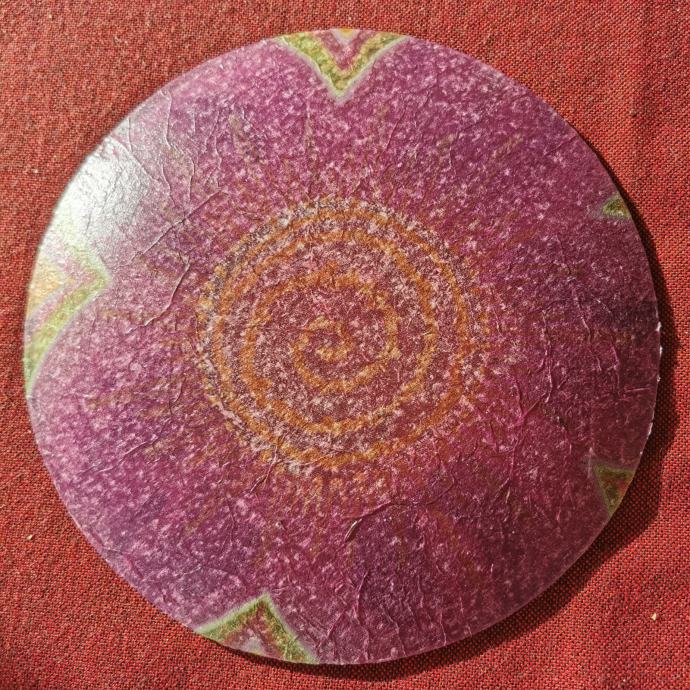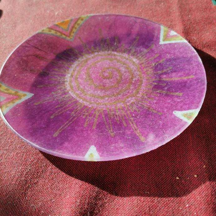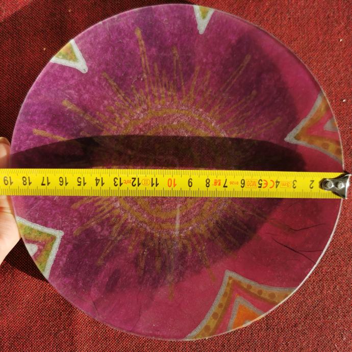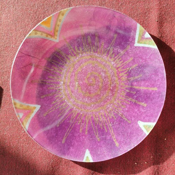 Okrugli stakleni tanjur ukrašen decupage tehnikom.