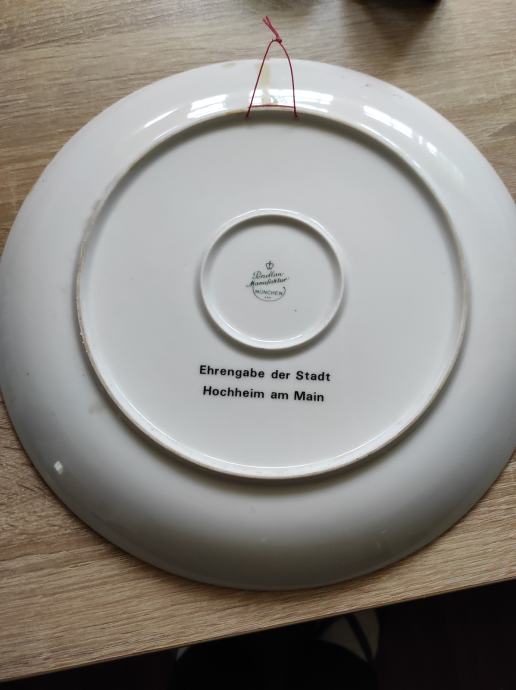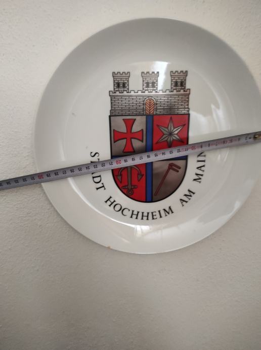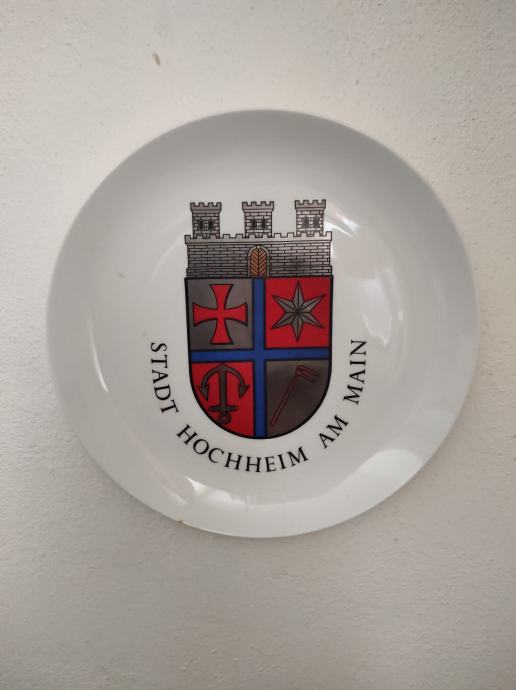 Porculanski ukrasni tanjur promjera 30 centimetara,dosta velik, bez ikakvih ostecenja,kao novi,sa natpisom i grbom grada Hockhheim.Saljem Poštom, Tiskom ili u dogovoru sa kupcem.Za sve informacije Nazovite na broj 097-6601365 ili pošaljite upit na Viber ili Njuškalo.Tanjur dugi niz godina bio kao ukras na zidu, izrađen od kvalitetnog Njemackog porculana.Pogledaj slike.!!