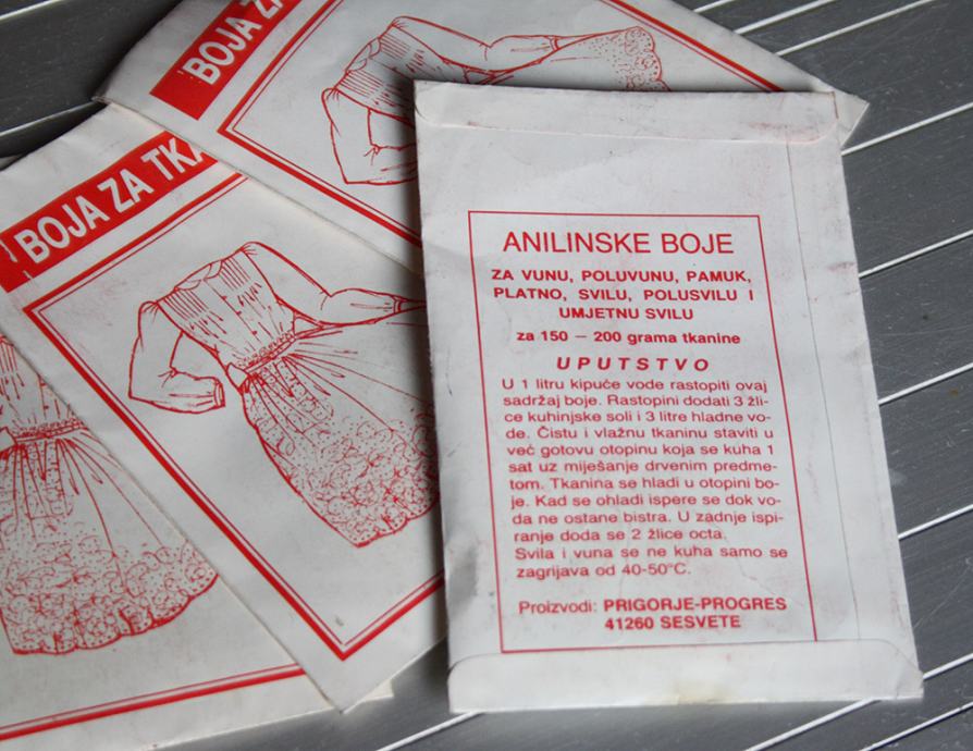 CRVENA BOJA ZA TKANINU - 6 vrećica - ANILINSKE BOJE - PRIGORJE PROGRES SESVETE ..za vunu,poluvunu,pamuk,platno,svilu,polusvilu i umjetnu svilu..Jedna vrećica je za 200 grama tkanine..Uputstvo za upotrebu nalazi se na vrećici..