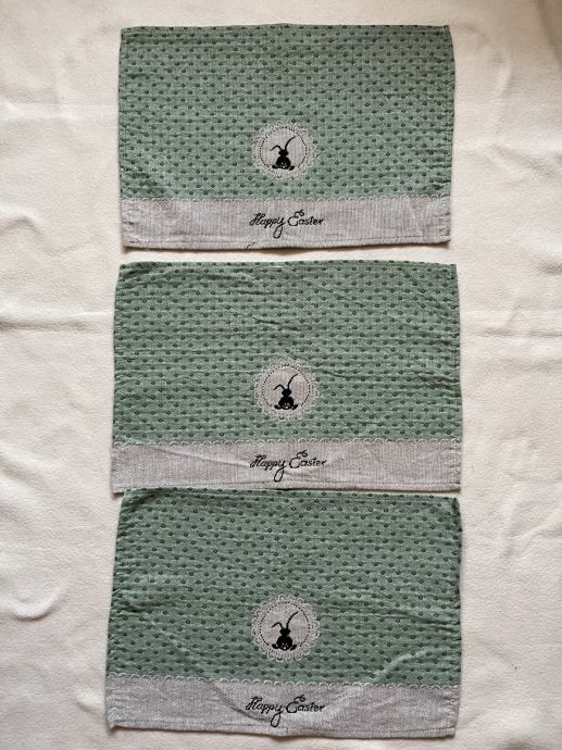 Prodajem set od 3 tekstilna podmetača s uskršnjim motivima. Podmetači su u nježnoj maslinasto zelenoj boji s točkastim uzorkom, ukrašeni izvezenim zečićem i natpisom "Happy Easter".Ukupno 3 komada, nisu korišteni. 47 cm x 32 cm