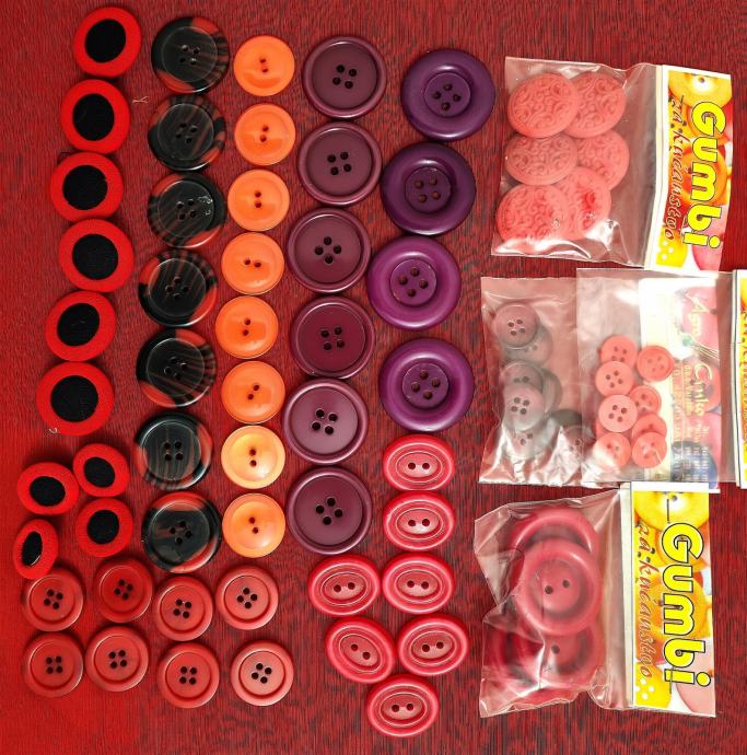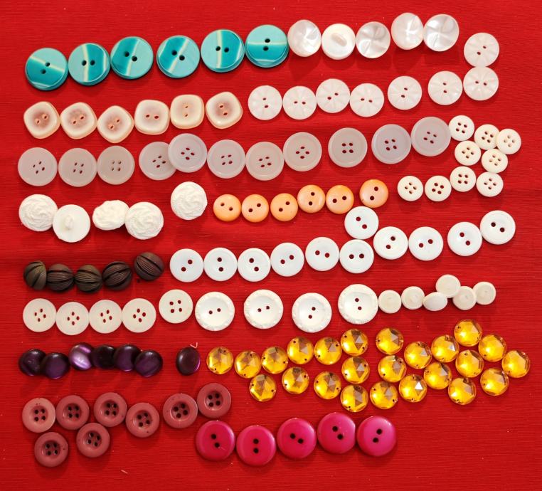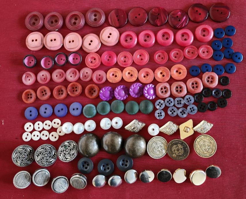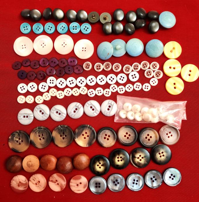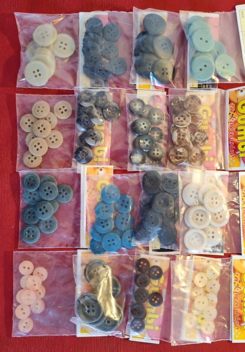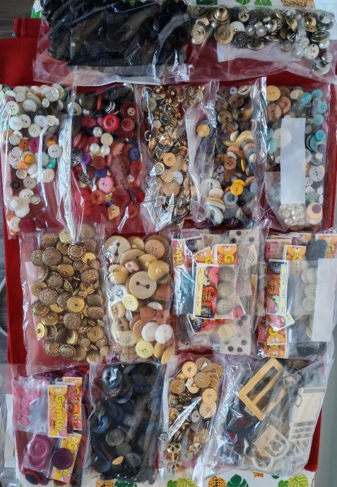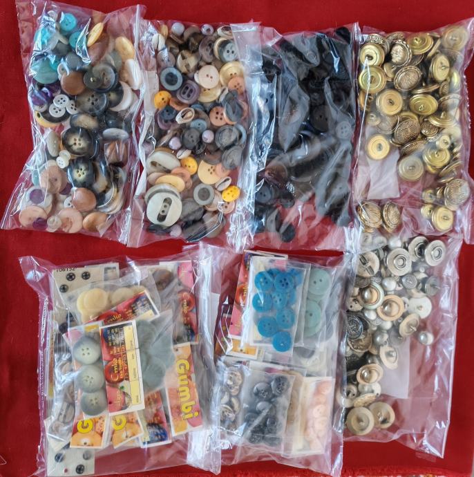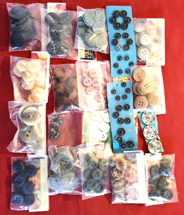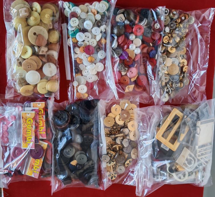 Novi gumbi i kopče za odjeću, ostalo od šivanja. Ima ih preko 1000 komada, plastičnih i metalnih. Svi su prikazani na fotografijama.