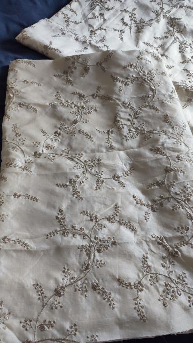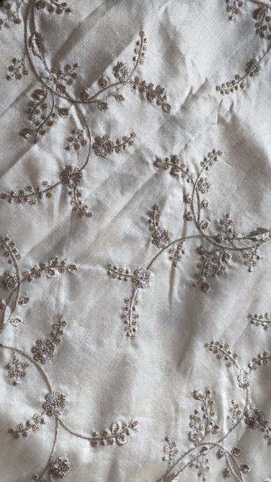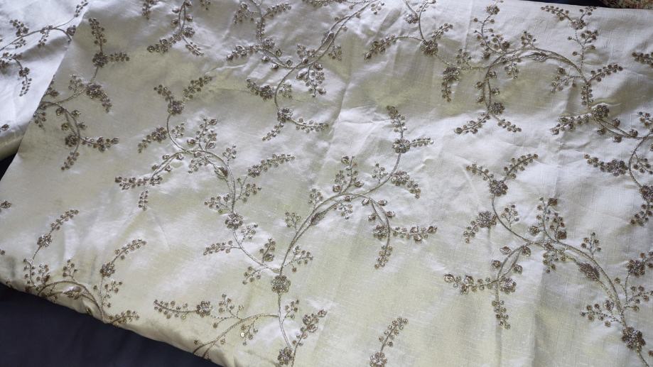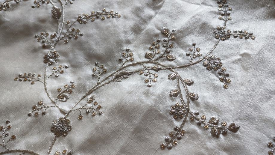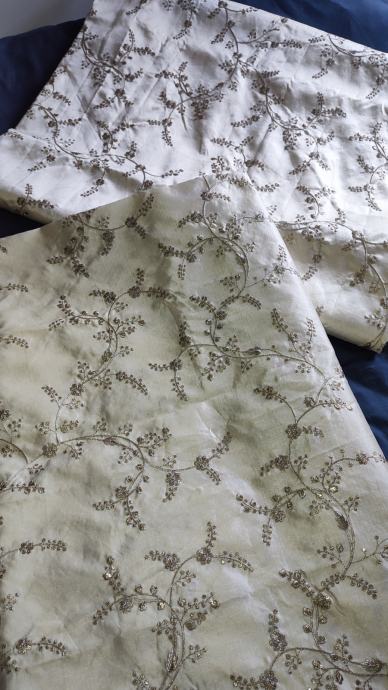 Prodajem prekrasan materijal za šivanje vjenčanice ili dekora, materijal viskoza i svila, boje slonovače, sa zlatnim i srebrnim vezom.