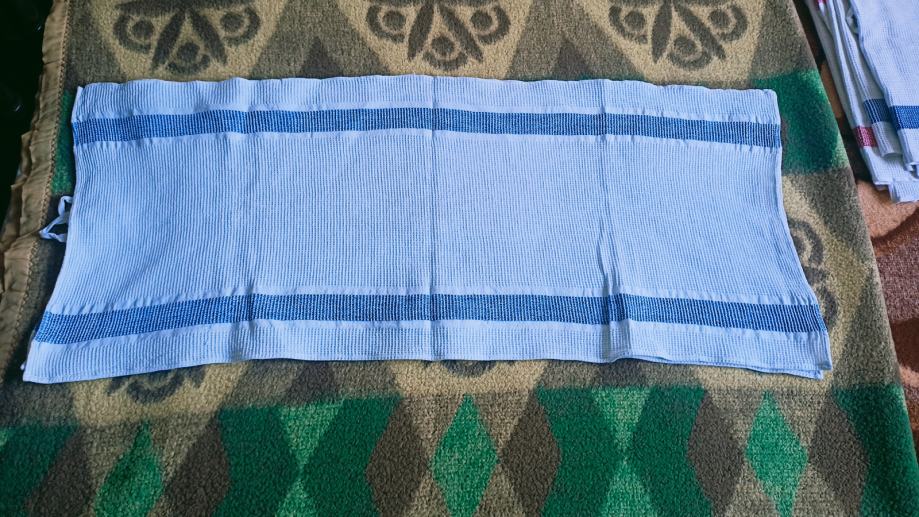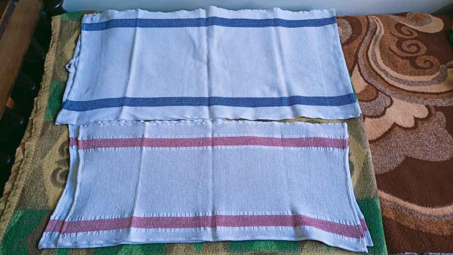 Na prodaju stare kuhinjske krpe sa fotografija, pronađene kod bake u ormaru, vjerojatno nekorištene. Cijena 10 eura za svih 6 komada. Dimenzije: plave veće 90x45 cm ,crvene 75x35 cm , plave manje 85x37 cm. Dostavu plaća kupac. Osobno preuzimanje moguće u Križevcima ili Zagreb glavni kolodvor. Ne šaljem pouzećem.