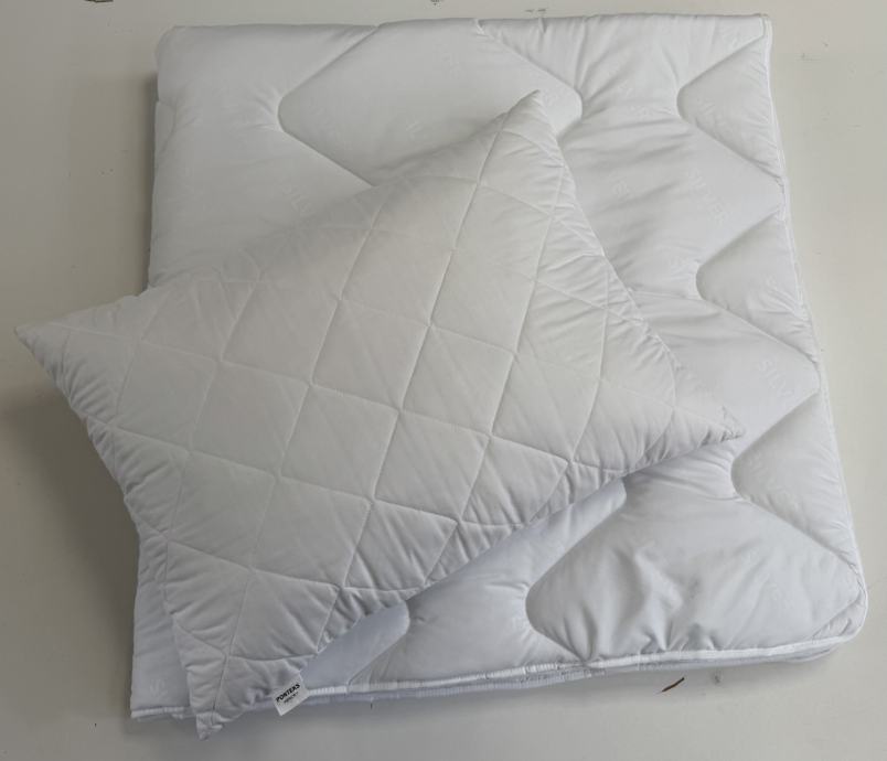 Komplet se sastoji od dva jastuka u dimenziji 60X80 koji su punjeni rezanom memory pjenom te popluna u dimenziji 200X200 koji je punjen 300 gramskim poliesterski vlaknom. Svi proizvodi su od mikrofibre (silver), mogu se prati u perilici i sušiti u sušilici.