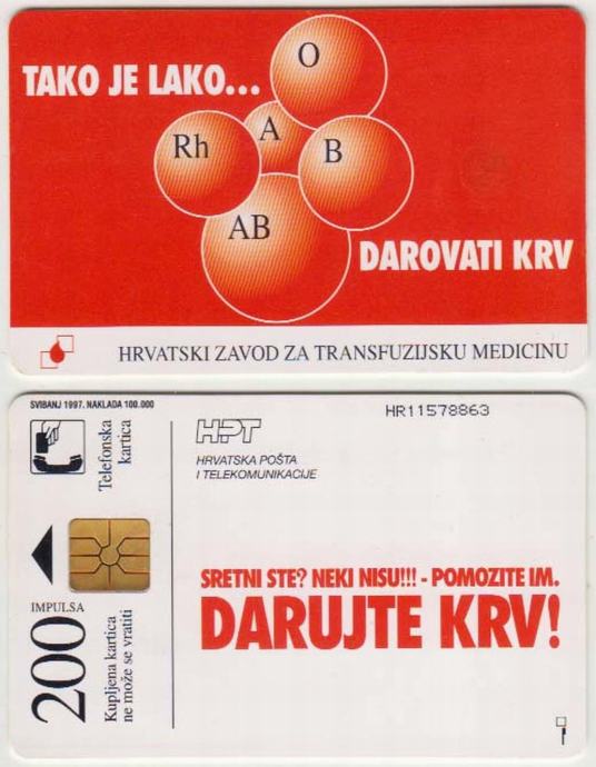 145 HRVATSKA CROATIA TEL.KARTICA TAKO JE LAKO DAROVATI KRV 1997 ČIP 2T
