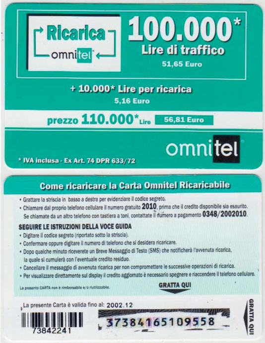 ITALIJA ITALY 65 OMNITEL BON ZA MOBITEL 100 000 L 2002.12